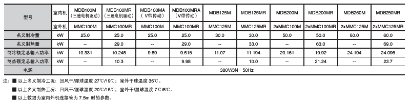 型號:MDB100MR~MDB250MR 制冷量:25~60kW 制熱量:29~69kW 制冷劑:HCFC-22
